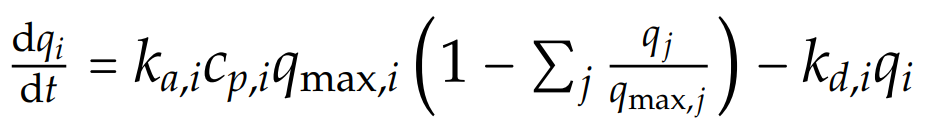 * \frac{\mathrm{d}q_i}{\mathrm{d}t} &= k_{a,i} c_{p,i} q_{\text{max},i} \left( 1 - \sum_j \frac{q_j}{q_{\text{max},j}} \right) - k_{d,i} q_i