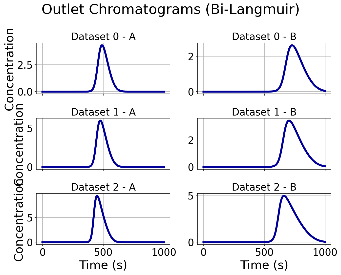 plt.suptitle("Outlet Chromatograms (Bi-Langmuir)")