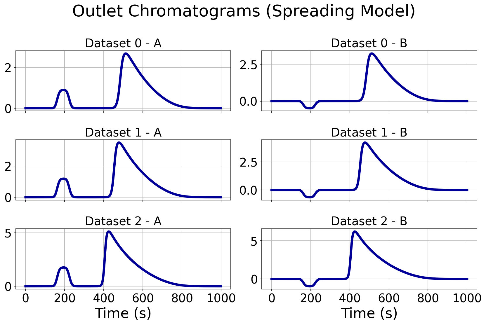 plt.suptitle("Outlet Chromatograms (Spreading Model)")